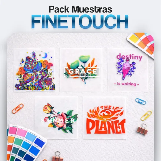 Incluye muestras del nuevo DTF FineTouch con blanco inteligente y una pantonera para que puedas ver la textura y la viveca del color.